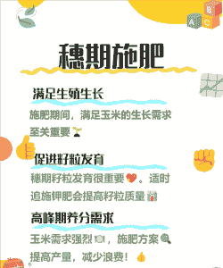 - 大喇叭口期(7-9叶):需肥量最大,以氮肥为主,配合磷钾肥,促进穗大粒多;