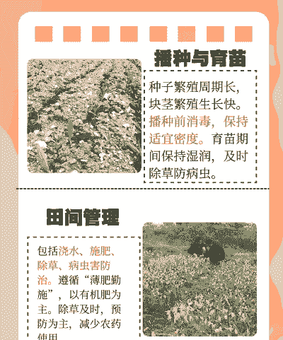 选种:选择中等大小、芽眼多、无病害的块茎,每块带1-2个芽,沾草木灰或多菌灵消毒后栽种。
