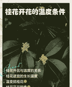 桂花开花适宜温度是15~28℃。桂花生长期能忍受33℃的高温和-13℃的低温环境,冬季温度过低的时候需做好防护措施。桂花开花的时候,需将空气湿度维持在75~85%之间,以利于桂花的生长,桂花生长期间还需要充足的光照,每天光照时间不能低于6~8小时,否则会影响桂花开花。