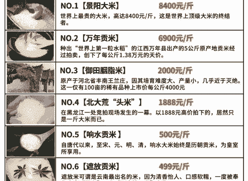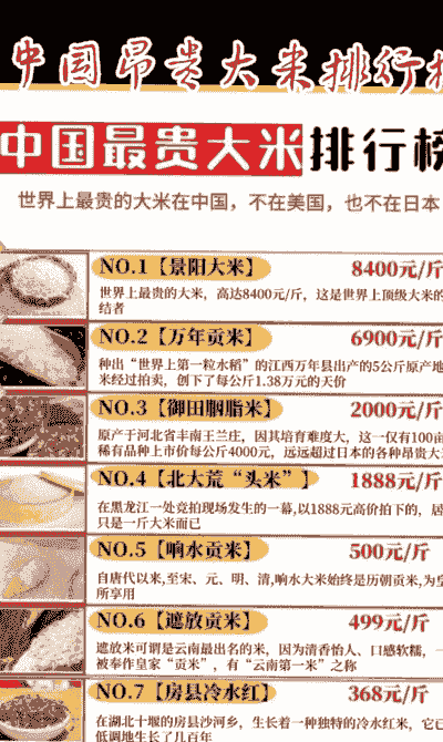 价格高达8400元/斤。这种大米产自中国湖北省建始县景阳镇,是一种有机绿色食品,以其独特的口感和营养价值而闻名于世。