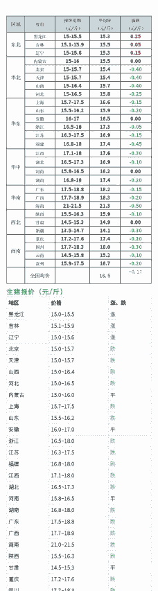 - 吉林:价格区间为7.0-7.2元/斤,屠宰企业报价小幅调整;